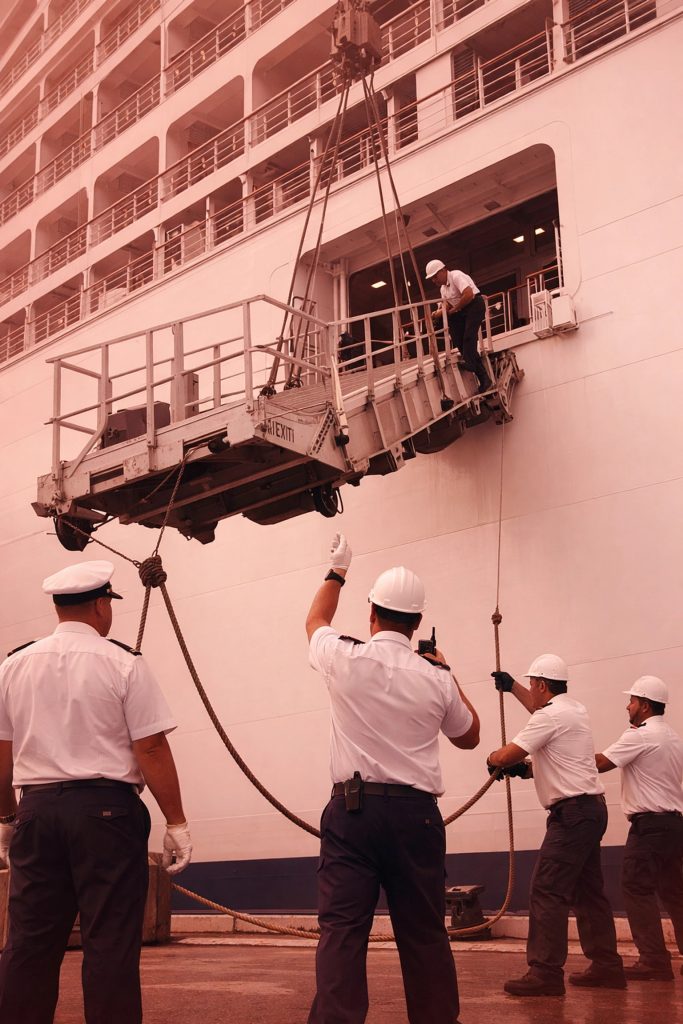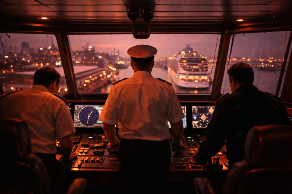 About two hours before departure, the bridge team begins serious work. The Captain and officers review the navigation plan, check weather updates, confirm the departure sequence, and start communication protocols with port authorities and the harbor pilot.