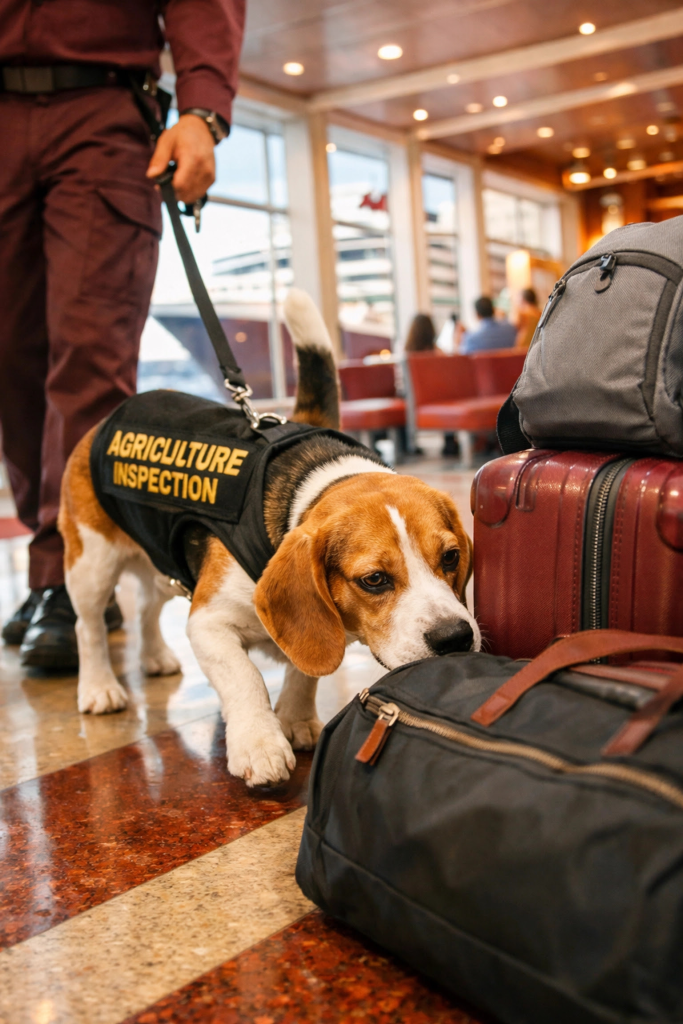Most passengers never see this happening, the dogs usually work early in the morning before the main disembarkation begins, but it's a critical step in the clearance process.