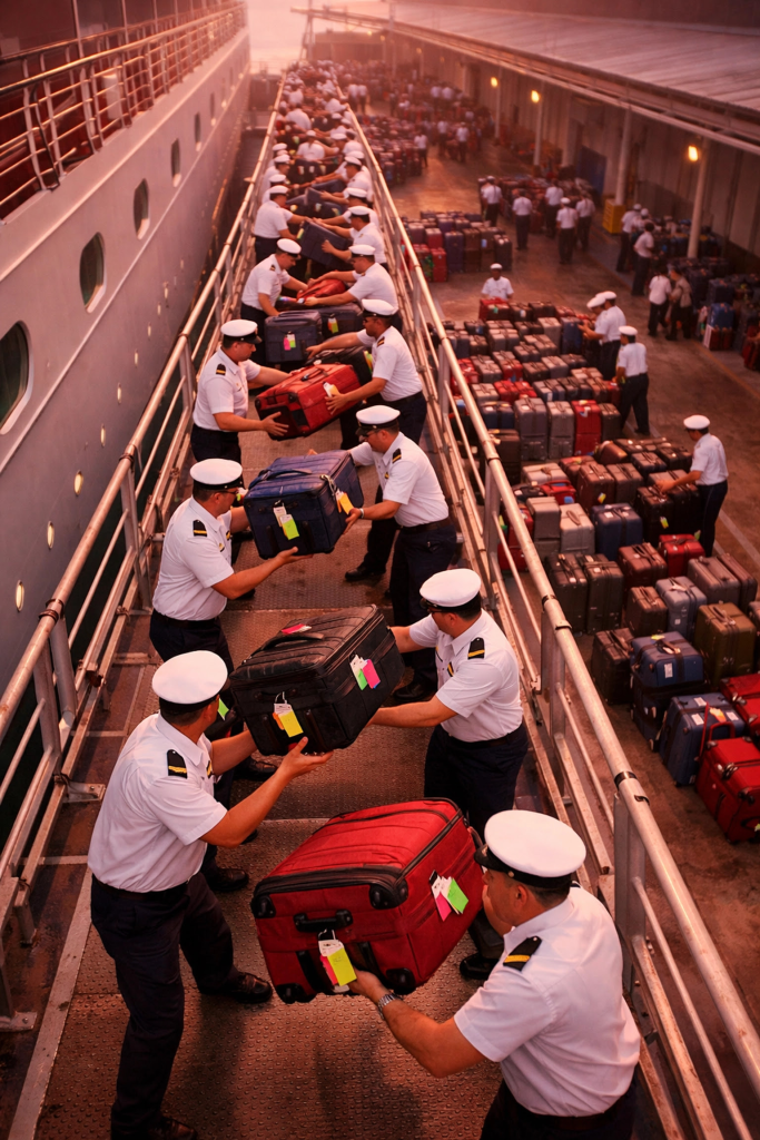 - The Transfer: Once the ship is cleared and the terminal is ready, crew members form literal assembly lines, passing bags from person to person down the gangway and into the terminal building.